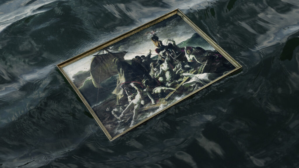 „A Succession of Waves” greift die Unmöglichkeit auf, den unerschöpflichen Wellengang zu erfassen, indem es drei Versuche präsentiert, diesen filmisch darzustellen. Zuerst, in Obholzers „2 days left”, ist die Welle künstlich konstruiert: ein anthropogener Kunstgriff, der durch eine abstrakte Abfolge von bewegten Bildern eingefangen wird. Im zweiten Versuch, Wangs „One Thousand and One Attempts to Be an Ocean”, wird die eilige Abfolge der Szenen überwältigend, eine Flut, die uns an unendliches Scrollen und latente Bedrohungen erinnert. Das letzte Beispiel, „The Ship Is Sinking” von Stracke & Seibt, geht auf einen Moment der Stille zurück, in dem das Floß der Medusa, ein großartiges Symbol für den zerrütteten Horizont des Menschen, durch das Verschmelzen von zwei Ebenen und Materialitäten zu einer re-inszeniert wird.